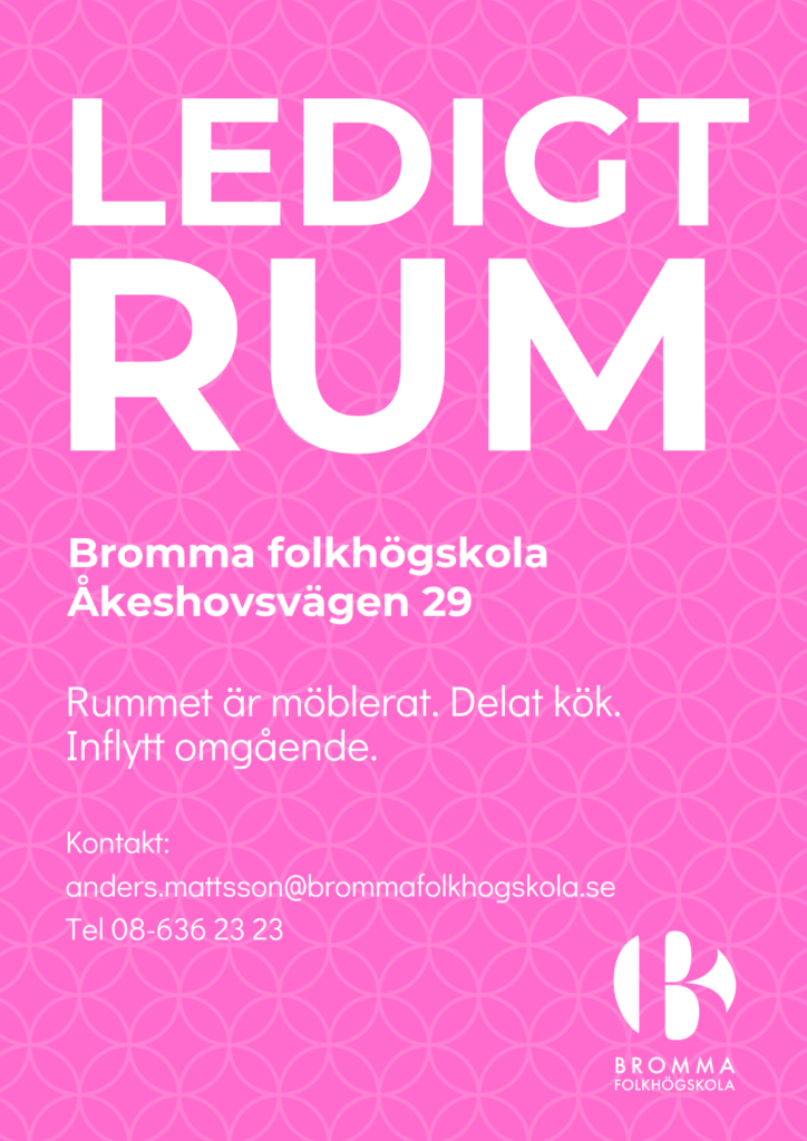 Vi har fått ett ledigt rum på vårt studentboende, adress Åkeshovsvägen 29 i Bromma.