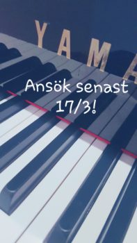 På söndag 17 mars är det sista ansökningsdag till våra musikutbildningar. Ansöker gör du här på hemsidan. Antagningsprover sker under vecka 17 och 18. Kallelser till antagningsprov skickas ut via mejl den 1 april.